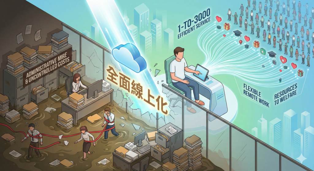 面對會員激增,傳統工會常陷入行政泥淖,但陳榮昌推動的「全面線上化」打破了管理天花板。目前,一名行政人員透過雲端系統可服務 3,000 名會員,甚至實現居家辦公。這種數位邏輯,確保了工會在組織擴張時,行政成本不會隨之失控,反而能將資源轉向提升會員福利。